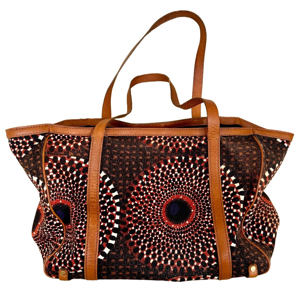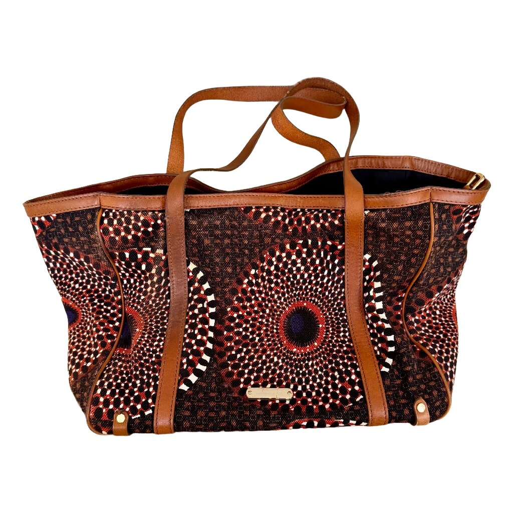 Die Henkel sind aus Leder, die Tasche aus Stoff und Leder.