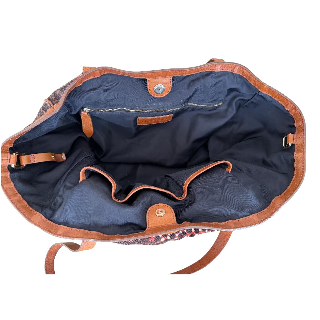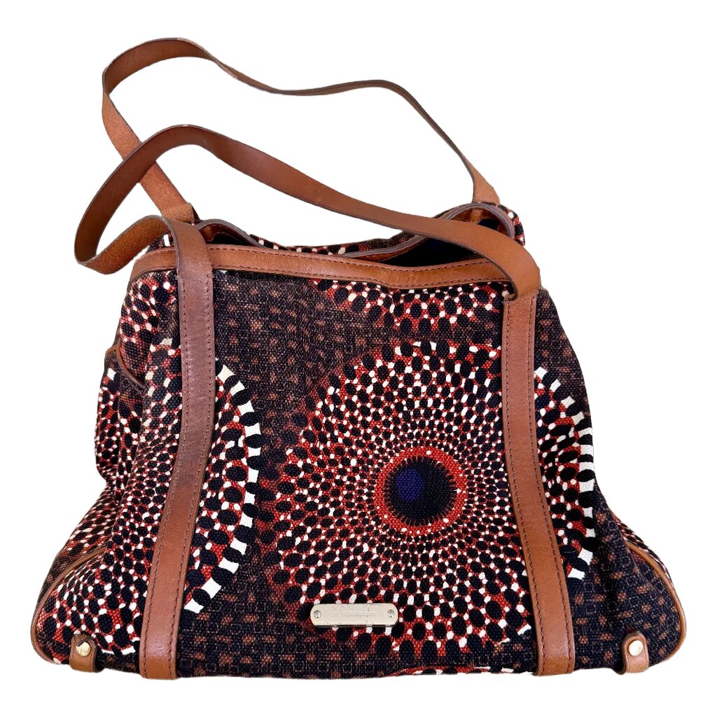 Die Tasche besteht aus einem Materialmix aus Stoff und Leder.