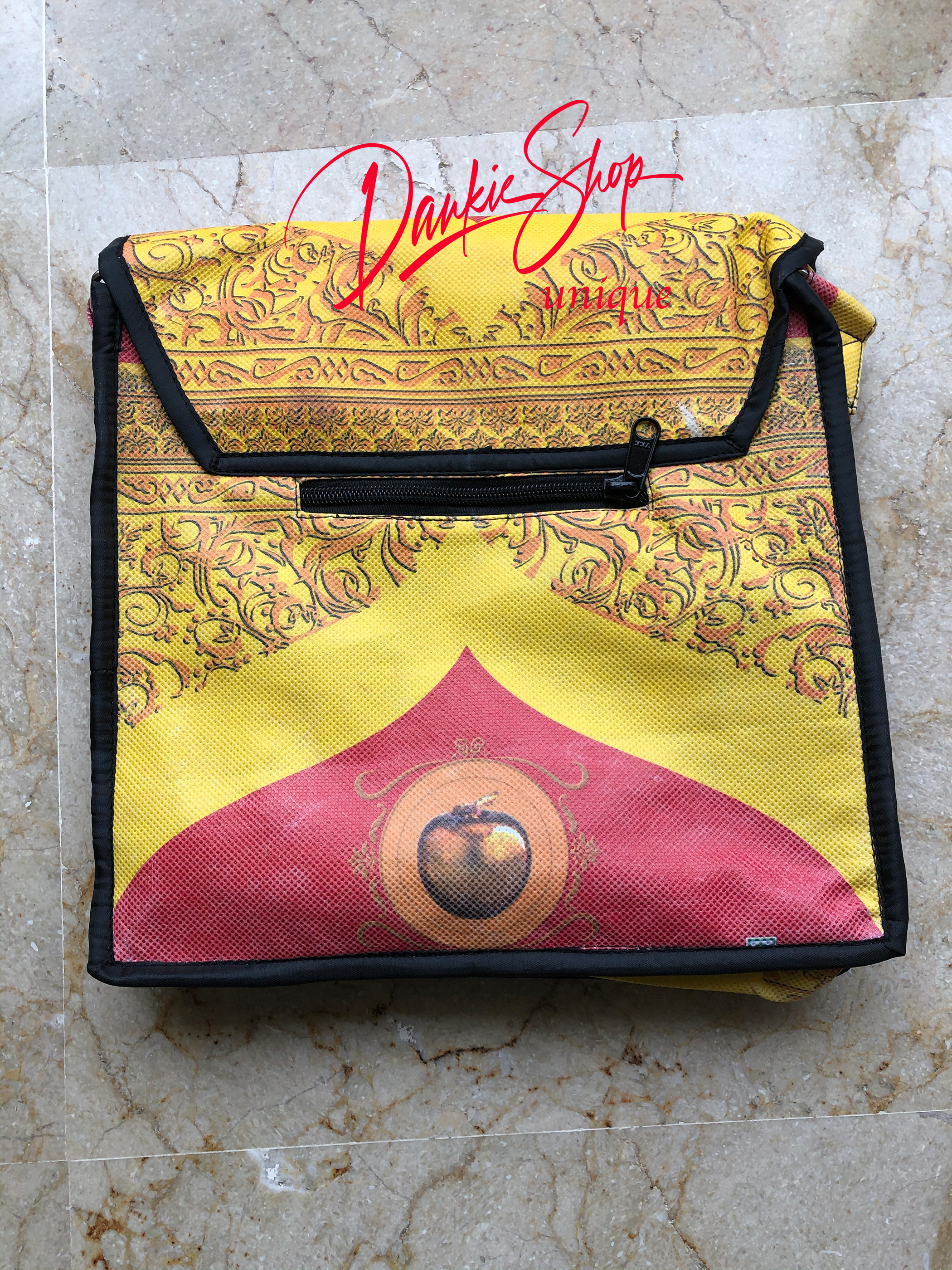 Mit Magnetverschluß und vielen kleinen Innentaschen und Außentasche (auch fürs Handy) aus recycelten Reissäcken.