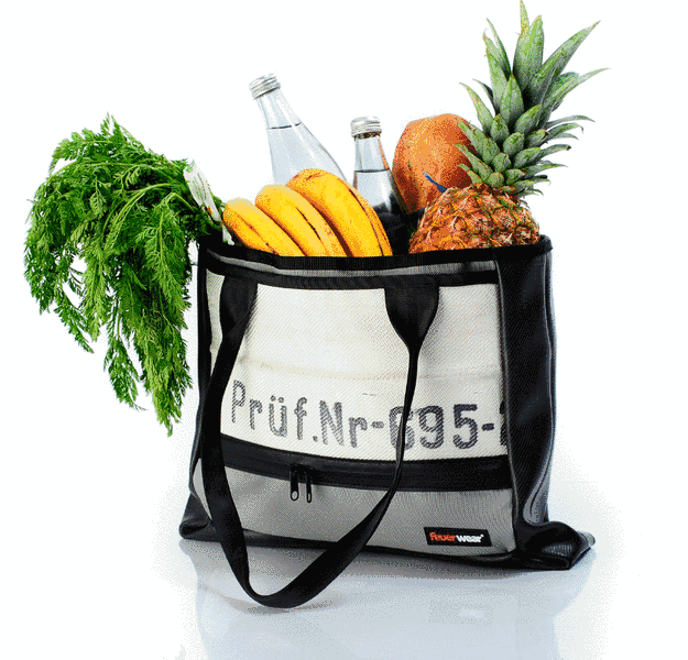 The unique markings from numerous fire stations and traces of use on firefighting missions make every shopping bag Dan a one-of-a-kind piece.