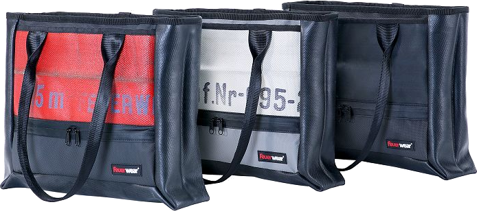 Las marcas únicas de numerosas estaciones de bomberos y los rastros de uso en las misiones de lucha contra incendios hacen que cada bolsa de compras Dan sea una pieza única en su tipo.